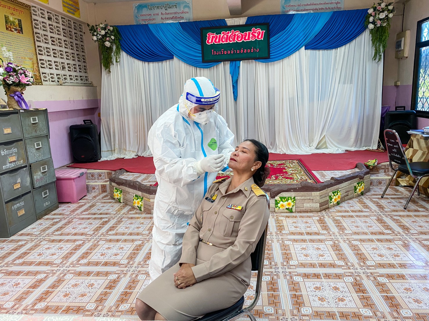 นางพัชรินทร์ ศรีวุฒิพงศ์ ผู้อำนวยการโรงเรียนบ้านอ้อยช้าง คณะครูและบุคลากรทุกคน ตรวจคัดกรอง ATK (Antigen test kit)